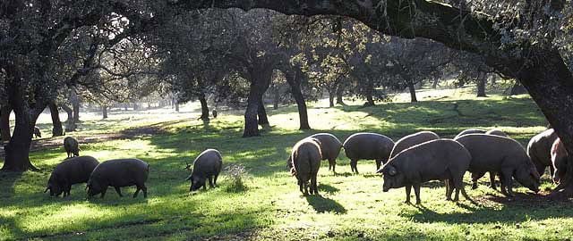 Abanico de cerdo ibérico de bellota, criado en la Sierra de Huelva, una comarca que abarca municipios como Jabugo, Aracena, Cortegana y otros, reconocida por su denominación de origen protegida y su entorno natural excepcional.