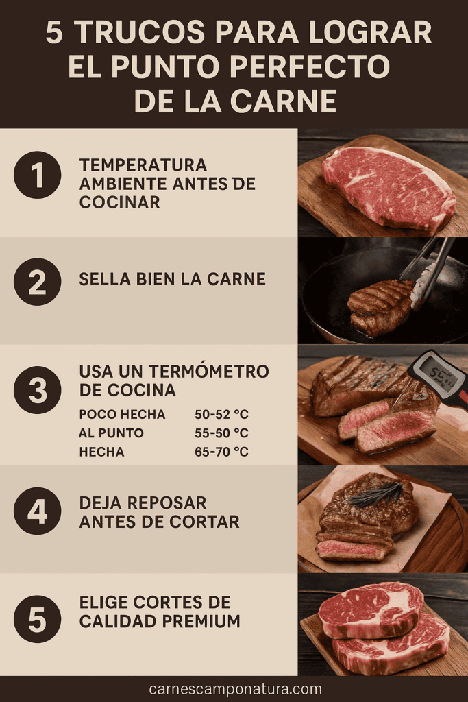¿Estás cansado de que tu carne quede dura, seca o pasada de cocción?, ¿Quieres sorprender a todos con una carne jugosa, tierna y en su punto exacto? Imagina cortar un chuletón y que los jugos broten al primer corte, con un aroma irresistible que conquiste a todos en casa. 5 trucos para lograr el punto perfecto de la carne, lograr ese resultado profesional no es un misterio… solo necesitas los trucos correctos y la mejor carne premium para tus preparaciones. Hoy te revelamos los 5 secretos que utilizan los chefs expertos y parrilleros profesionales para lograr el punto exacto y convertir cualquier filete o costilla en un auténtico manjar.